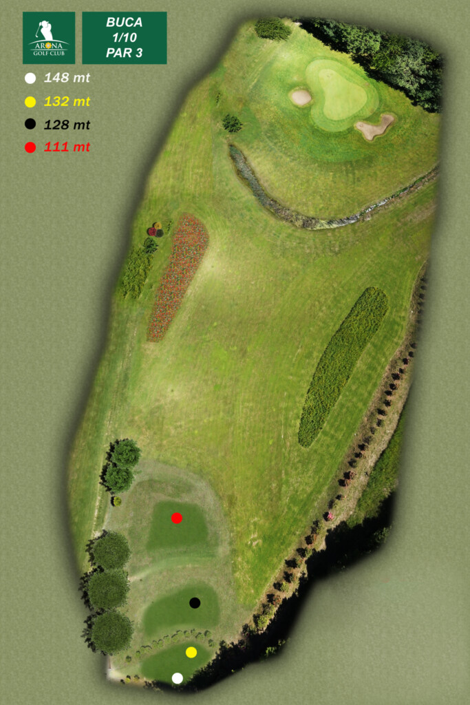 BUCA 1 Arona Golf Par 3 con partenza sopraelevata, è un buon inizio di percorso perché non presenta grandi difficoltà.Due aiuole fiorite si aprono verso il green, ben difeso da 2 bunkers e da un ostacolo d’acqua che entra in gioco raramente.
