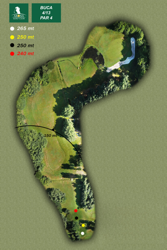 Par 4 corto con “dogleg” a destra. Il primo colpo va piazzato dritto in apertura, il secondo potrà così oltrepassare il laghetto per atterrare in green.