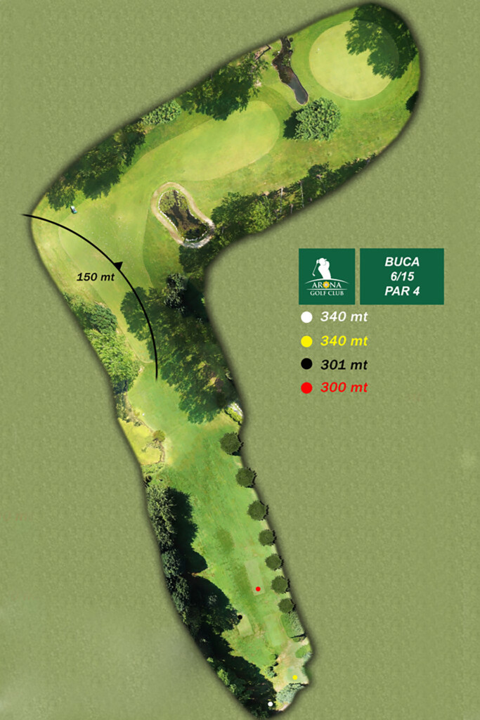 Par 4 con “dogleg” a destra. Al termine del filare di pioppi, con lago sulla destra (il lago sulla sinistra, confine con la buca precedente in realtà non entra in gioco), si può portare il colpo al green, che richiede buona precisione ma consente margini di errore ai lati e dietro. Il green è difeso da un bunker.
